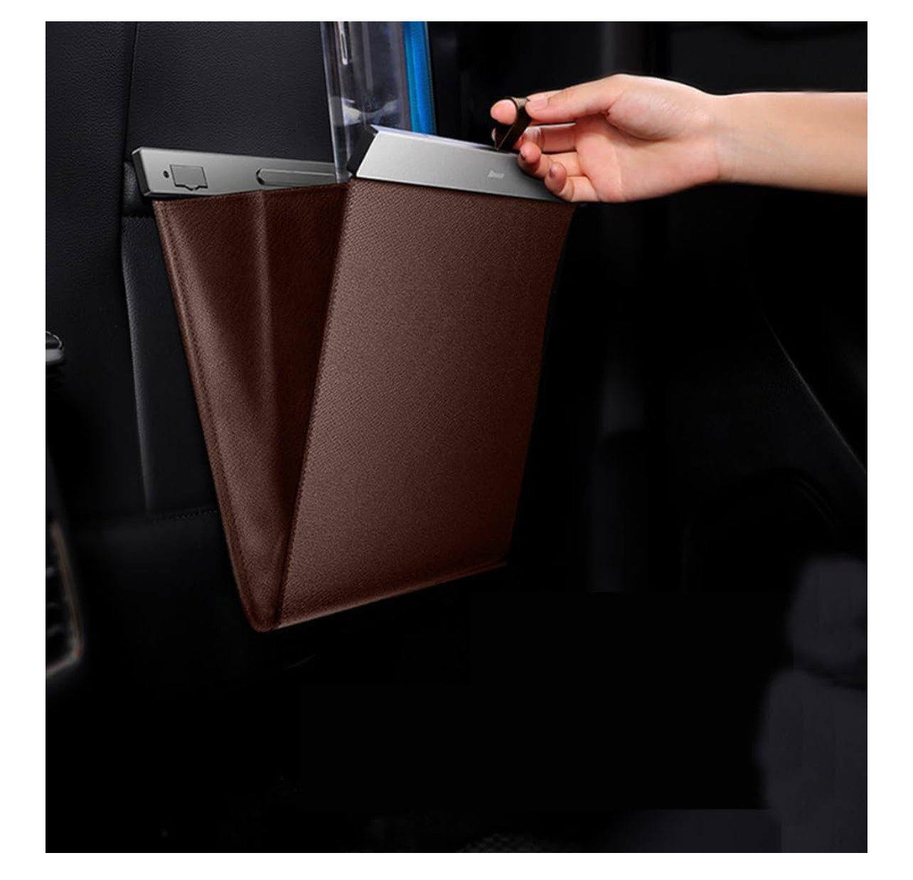 Car Trash Bag, Slim Design Garbage Cans, PU Material Trash Bins Hanging for Car Seat Back Organizer Storage Bag,Multi-Purpose Suspended car Trash Bag (Brown)